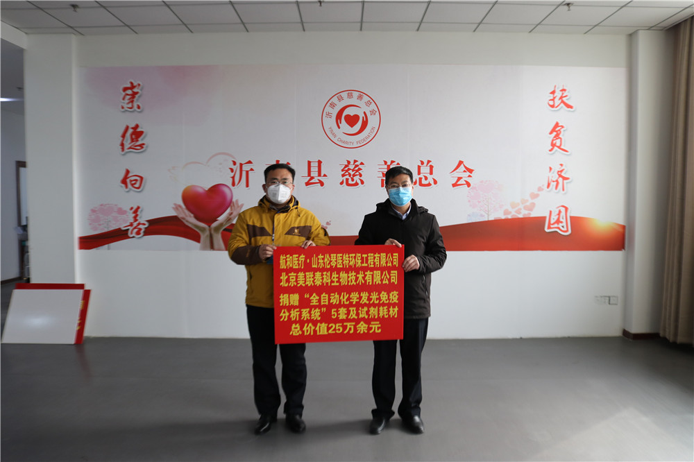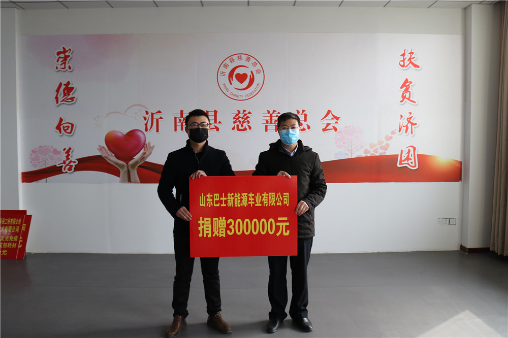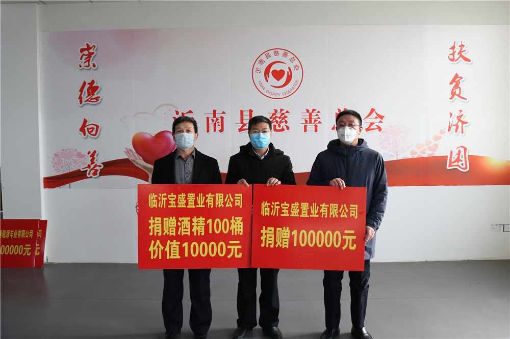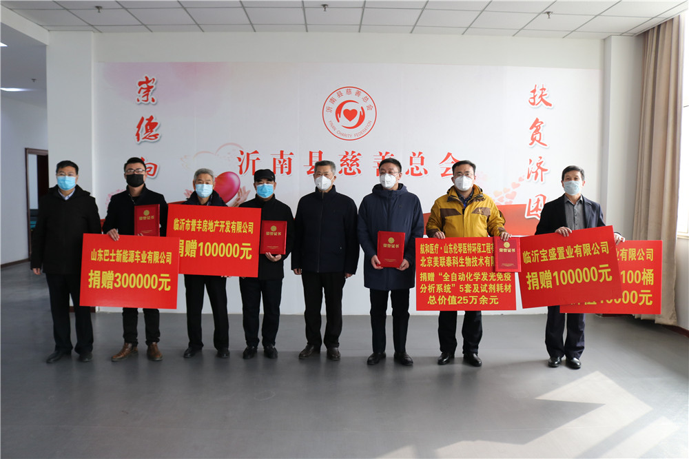为抗击新冠肺炎疫情,山东巴士新能源车业有限公司捐赠30万元;临沂宝盛置业有限公司向县慈善总会捐赠酒精100桶,价值1万元;航和医疗·山东伦琴医特环保工程有限公司、北京美联泰科生物技术有限公司捐赠“全自动化学发光免疫分析系统”5套及试剂耗材,价值20万元。